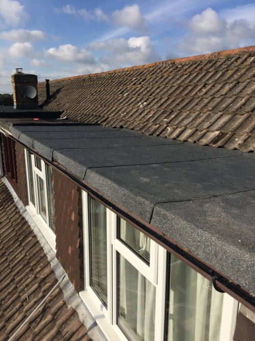 I would recommend rip up the existing and re deck the flat roof and put a run on it. so the water runs off correctly. i would do the job properly to save paying for it again.
